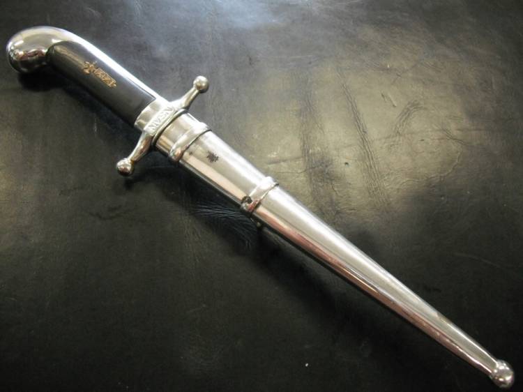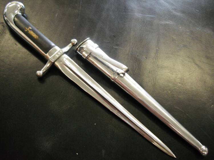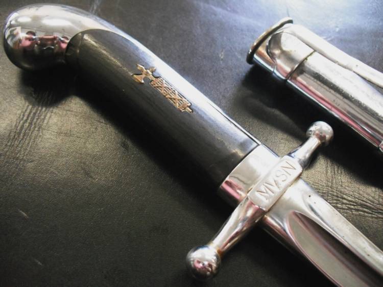 PUGNALE MODELLO 23 PER MOSCHETTIERI DEL DUCE. LAMA A SEZIONE CRUCIFORME. IMPUGNATURA A FORMA DI MANICO D´OMBRELLO CON CAPPETTA TERMINALE ARROTONDATA, IN METALLO NICHELATO CON GUANCETTE IN EBANO E FASCI REPUBBLICANI DORATI INCASTONATI. GUARDAMANO CON INCISIONE M.V.S.N. (Miliaia Volontaria Sicurezza Nazionale)DA UN LATO E NUMERO DI MATRICOLA DALL´ALTRO, GUARDIE CHE TERMINANO CON DUE BOTTONI DI FORMA SFERICA. FODERO IN LAMIERINO NICHELATO CON DUE FASCETTE E PASSANTE INCLINATO. RARO OGGETTO DA ALTA COLLEZIONE.