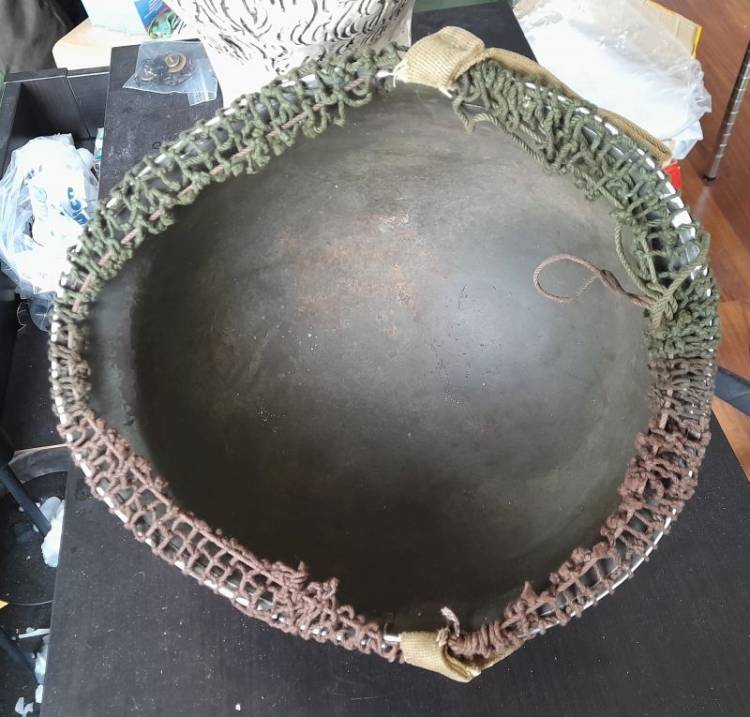 RARO ELMETTO M.1 DI PRIMO TIPO CON LE PARTI METALLICHE DEL SOGGOLO IN OTTONE. RETINA MIMETICA.