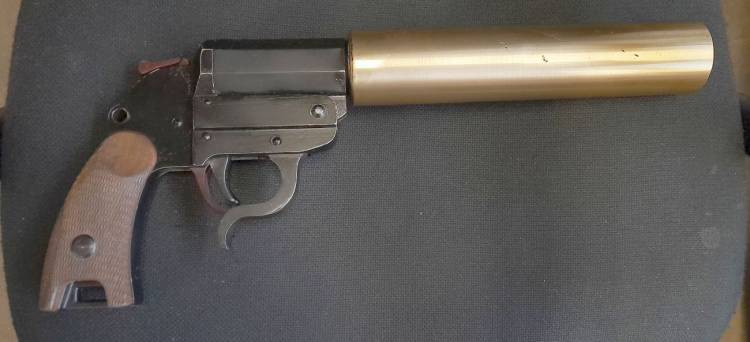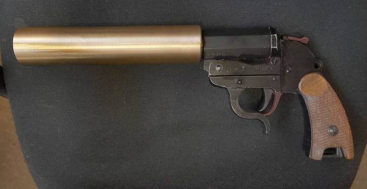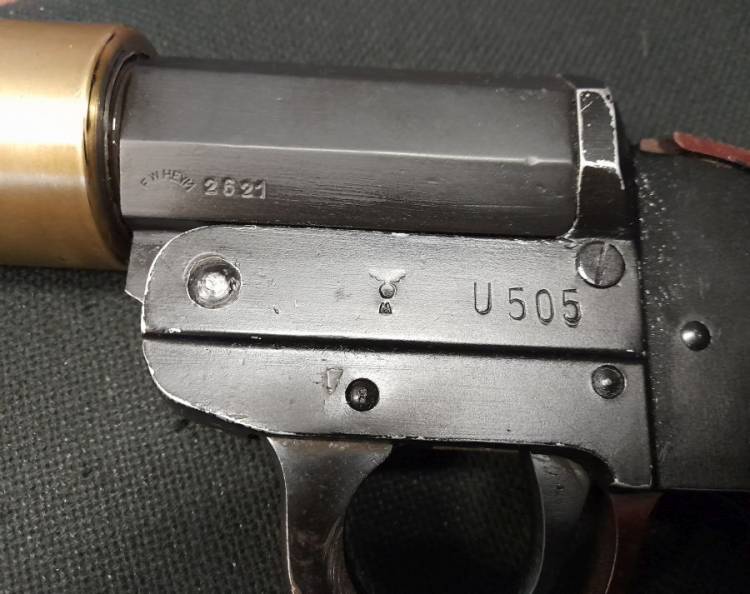 RARISSIMA PISTOLA LANCIASAGOLEDELLA KM IN DOTAZIONE ALL´U-BOAT 505 COME PUNZONATO NELL´AFFUSTO. AQUILETTA CHE SOVRASTA UNA ´M´, PUNZONE RISERVATO ALLA KRIEGSMARINE. LUNGA CANNA IN OTTONE CONTRO L´OSSIDAZIONE DA SALE. VECCHIA DISATTIVAZIONE, BASCULA E SCATTA. CONDIZIONI PERFETTE.