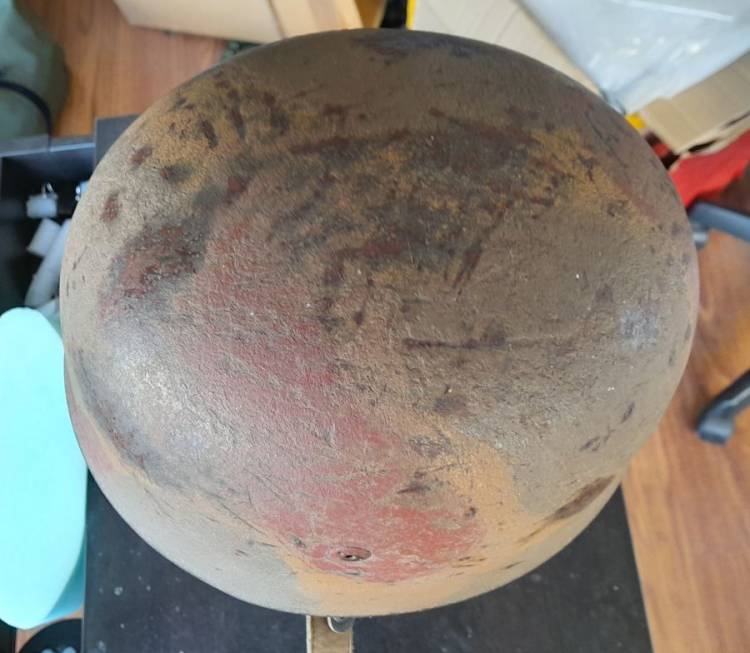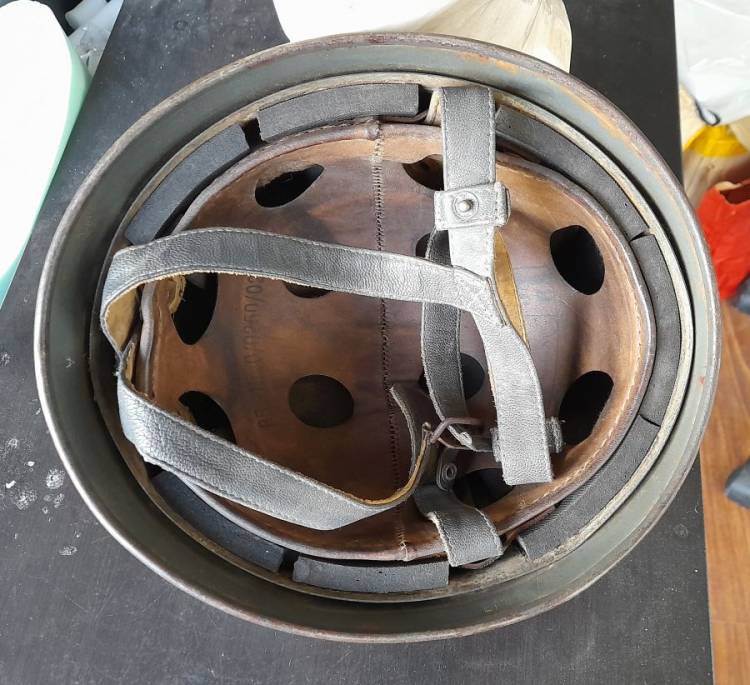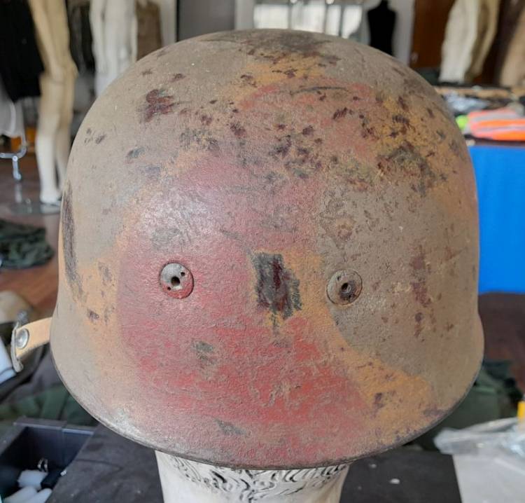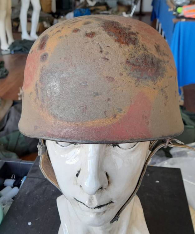 BELLISSIMO ELMO MOD. 38 DEI PARACADUTISTI TEDESCHI MIMETIZZATO A TRE COLORI, VERDE PALUDE, MATTONE, OCRA, CARATTERISTICO DELLA NORMANDIA. COMPLETO DI INTERNO E SOGGOLO. GUSCIO CON MARCHI NELLA FALDA: ´ET68´ E ´2498´. ECCELLENTI CONDIZIONI.