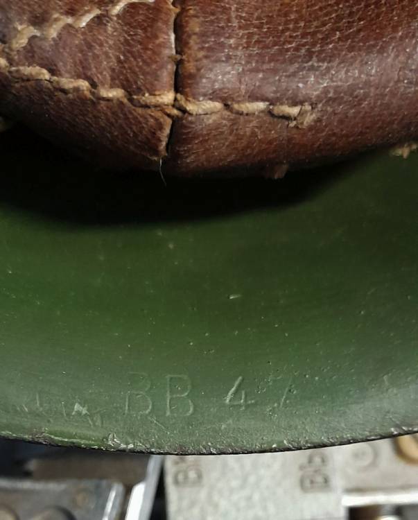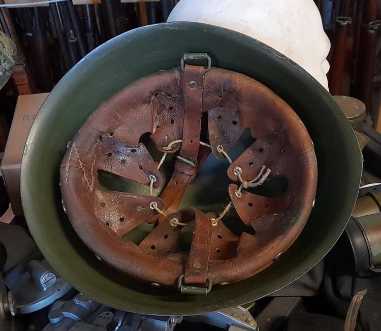 ELMETTO DELLA MARINA REPUBBLICANA/X^ MAS IN VERNICIATURA VERDE DA CAMPO (A PENNELLO), CON ANCORA GIALLA LEGGERMENTE FLUORESCENTE. INTERNO CON CUFFIA E SOGGOLO STANDARD, CON GUSCIO MARCATO ´BB 47´. CONDIZIONI MOLTO BUONE.