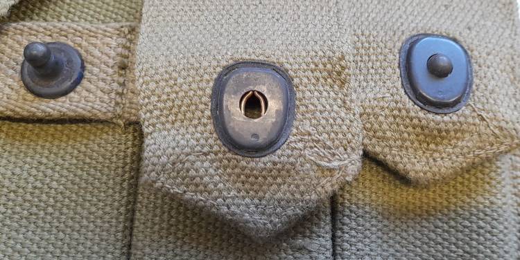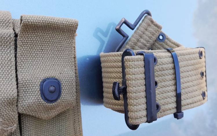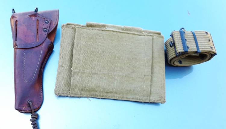 BEL CONVOLUT DI EQUIPAGGIAMENTO AMERICANO DELLA II GM. FONDINA, CINTURONE, PORTACARICATORI PER THOMPSON M.1. MATERIALE NON ASSEMBLATO, PROVIENE DALLO STESSO RINVENIMENTO.