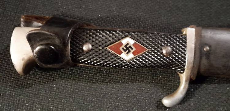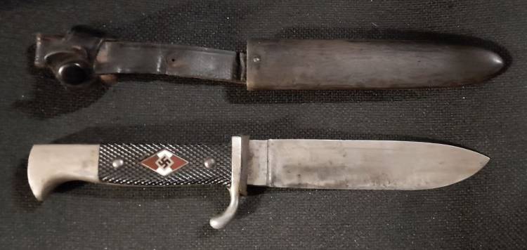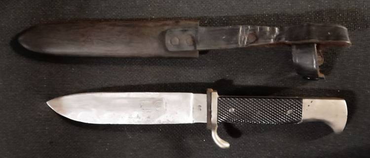 COLTELLO DELLA HJ DI III TIPO CON LAMA SENZA MOTTO ED AL VERSO CON DOPPIA PUNZONATURA DEL FABBRICANTE E DELLA RZM. RIPORTA ANCGE L´ANNO DI COSTRUZIONE ´39´. CONDIZIONI MOLTO BUONE.