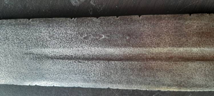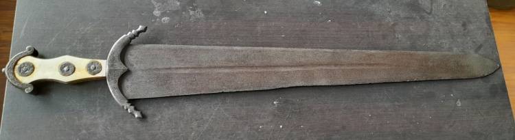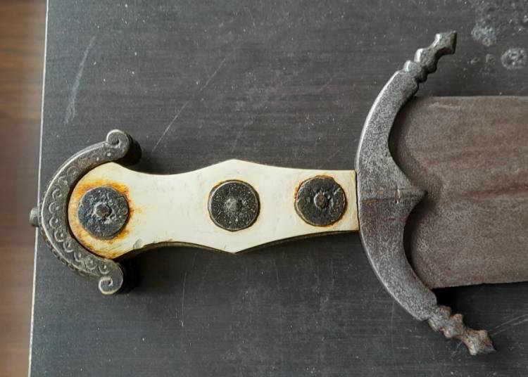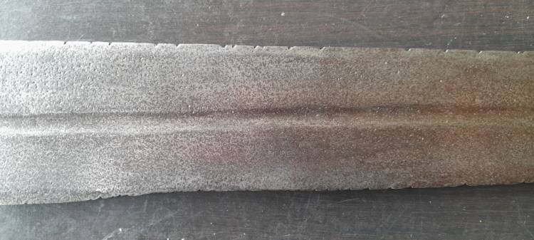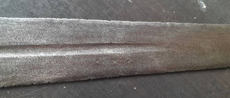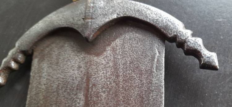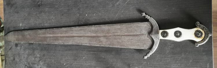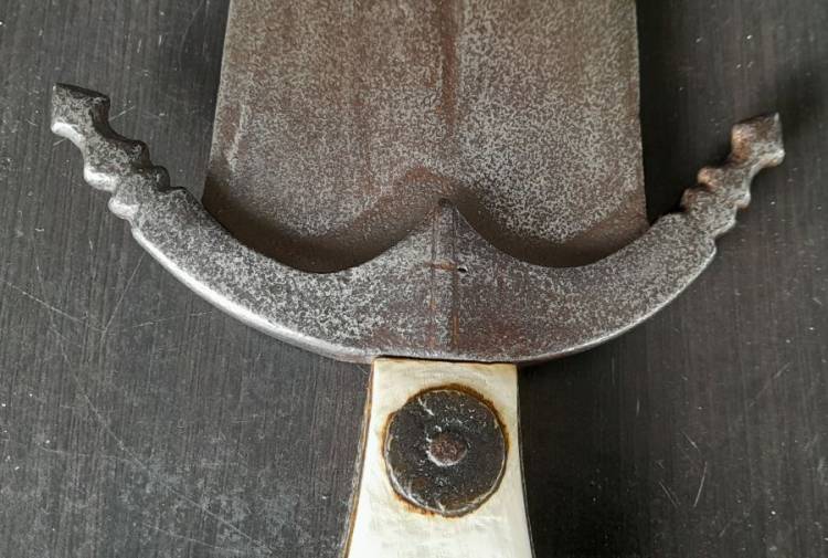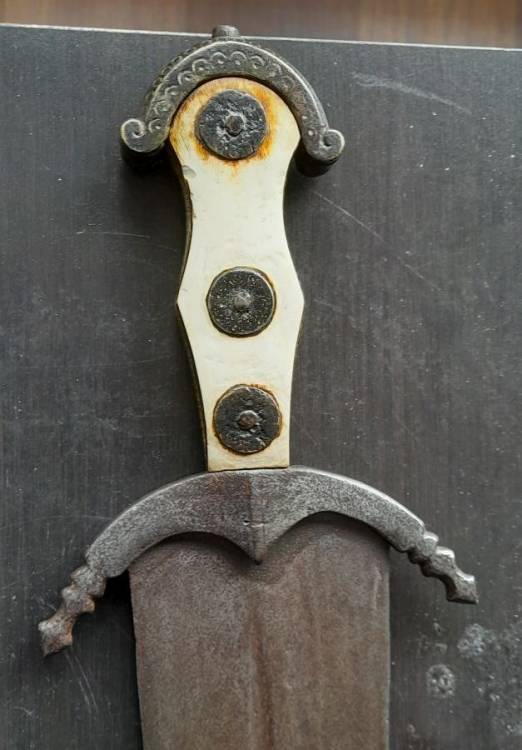 BELLA DAGA ´CINQUEDEA´ O ´LINGUA DI BUE´ CARATTERISTICA DELL´AREA VENEZIANA A CAVALLO DEL 1500. IMPUGNATURA IN OSSO E BRONZO. LAMA A DUE TAGLI CON DIVERSI SEGNI DI COMBATTIMENTO E DUE PICCOLE SFOGLIATURE DI LAVORAZIONE.