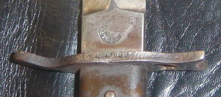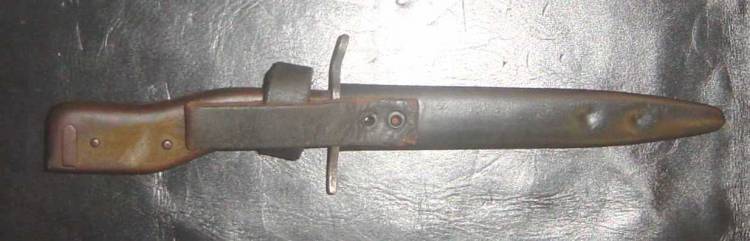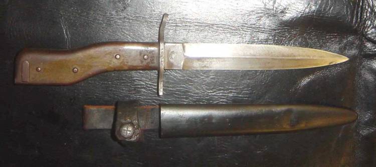 PUGNALE-BAIONETTA D´ASSALTO "DEMAG". LAMA MARCATA "DRGM" DA UN LATO, SUL RICASSO, E "DEMAG.DUISBURG" DALL´ALTRO. MANICO ONDULATO IN METALLO, CON VERNICE VERDE ORIGINALE PRESENTE AL 60%. COMPLETO DI FODERO PRIMO TIPO. ORIGINALE BELLICO TEDESCO I GUERRA MONDIALE. RARO.
