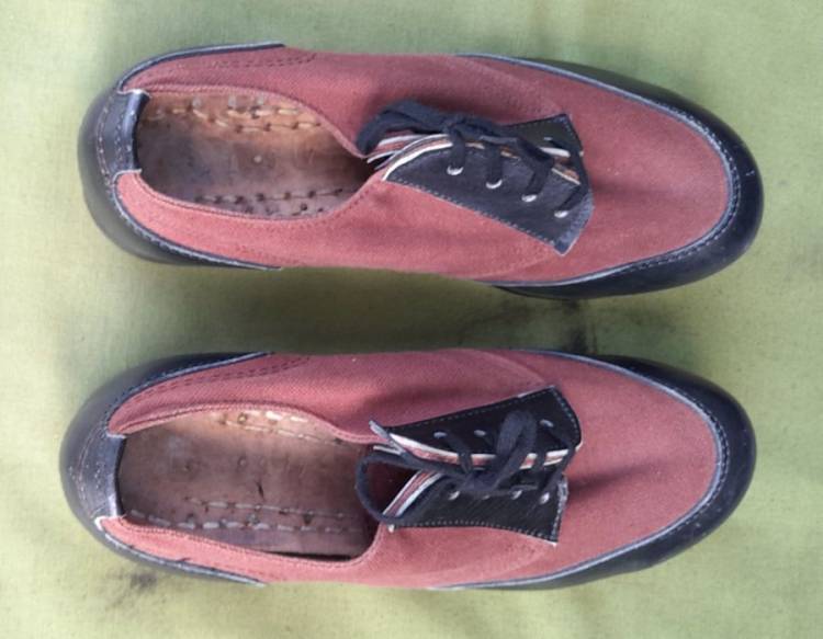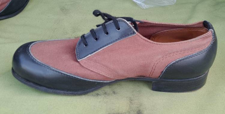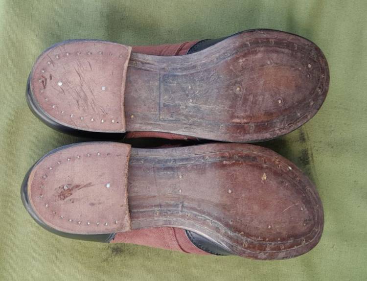 SPLENDIDE E RARE SCARPE DA PONTE PER LA TRUPPA DELLA KM TEDESCA DELLA II GM. COSTRUITE IN STOFFA MARRONE E PELLE NERA. CONDIZIONI PARI AL NUOVO.