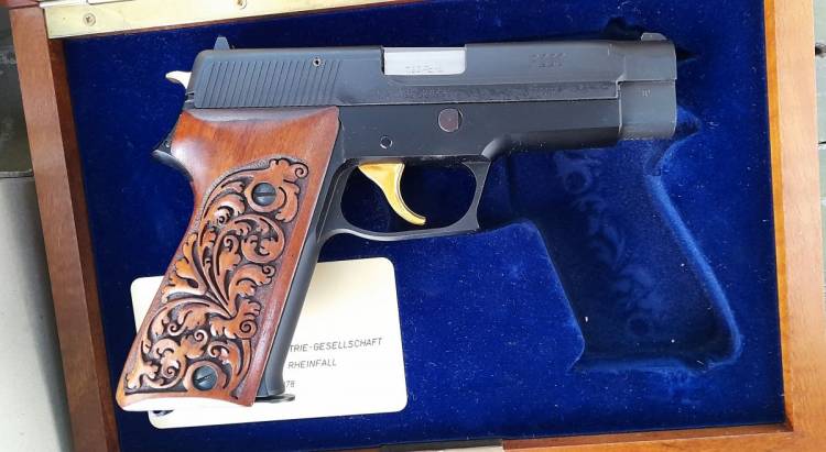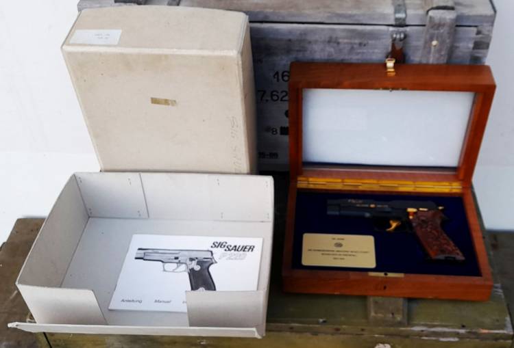 BELLISSIMA PISTOLA COMMEMORATIVA DELLA SIG SAUER MOD. P.220 FABBRICATA NEL 1978 IN OCCASIONE DEL 125° ANNIVERSARIO DALLA FONDAZIONE DELLA SIG (1853). CAL. 7,65 PB. RIPORTI IN ORO E GUANCETTE IN LEGNO SCOLPITE. IN CASSETTA.