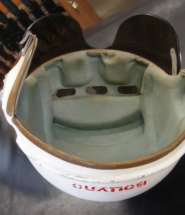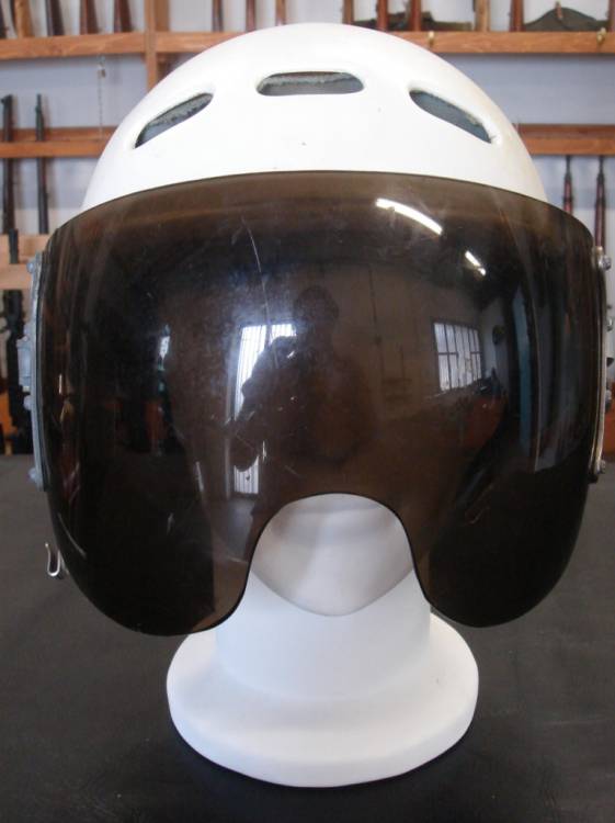 CASCO Mod. ZSh-3M DA PILOTA DI MIG.21 SOVIETICO. ALLUMINIO VERNICIATO BIANCO, CON NOMINATIVO DEL PILOTA IN CARATTERI CIRILLICI, IN ROSSO, SULLA PARTE POSTERIORE. VISIERA MARRONE. PERIODO DELLA GUERRA FREDDA.