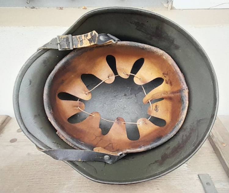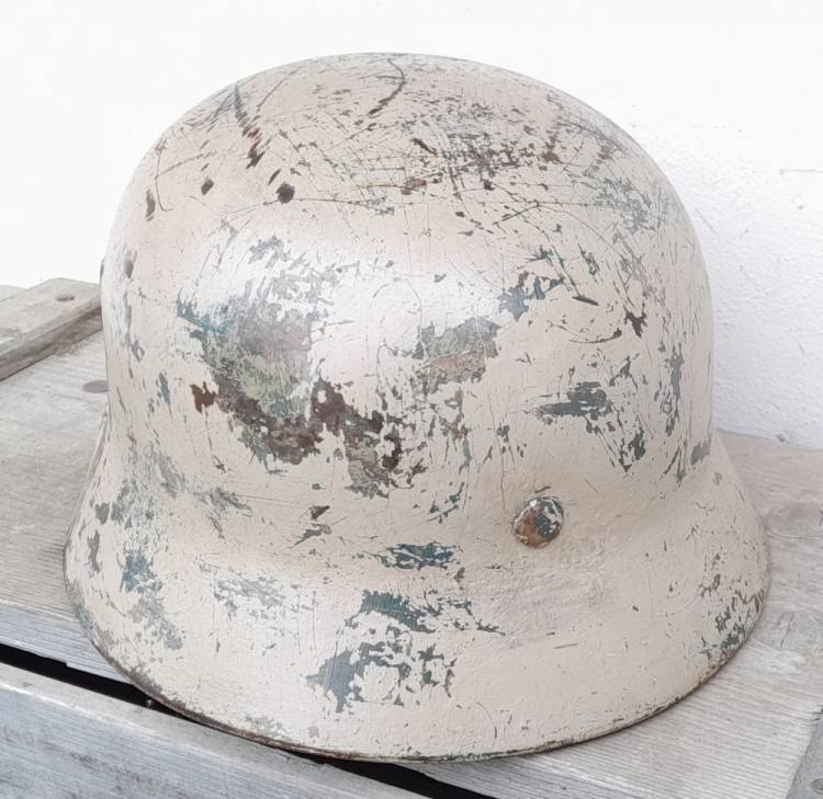 RARO ELMETTO M.40 CON VERNICIATURA BIANCO CREMA, ADATTO PER TEATRI CONTINENTALI ED INVERNALI. COMPLETO DI INTERNO CON INUSUALE MODFICA DI TAGLIA DA 57 A 56 TRAMITE SPESSORI IN SUGHERO E SOGGOLO. CONDIZIONI MOLTO BUONE.