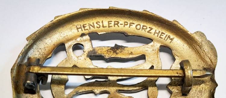 ´Deutsches Reichssportabzeichen in Bronze ´DRL´ mit Hakenkreuz´. Veniva concesso dalla Associazione per l´Educazione Fisica del III Reich (´Deutscher Reichbund fur Leibesubungen´). Marcato: ´HENSLER PFORZHEIM - D.R.G.M. 35269´.