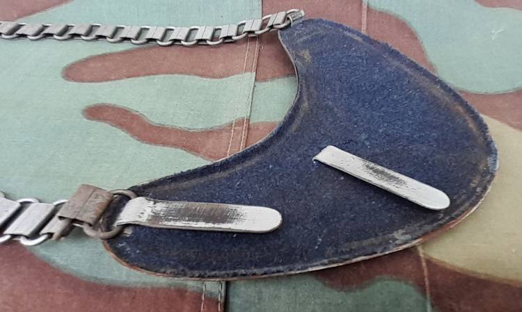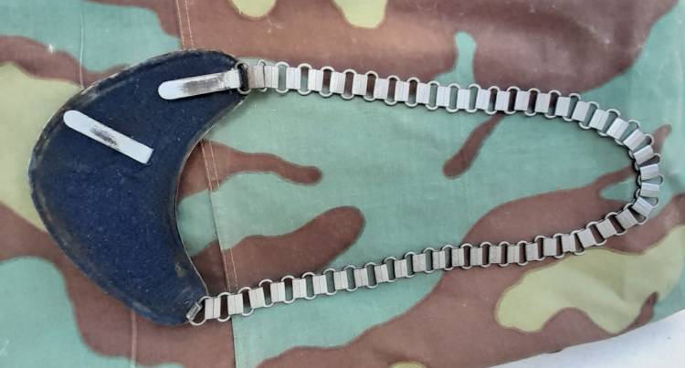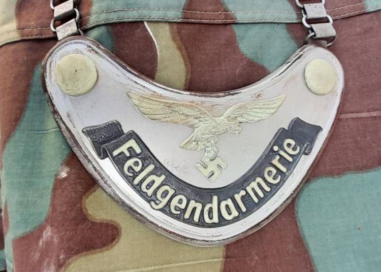 RARISSIMA GORGIERA DELLA FELDGENDARMERIE DELLA LUFTWAFFE. INTERAMENTE IN FERRO, ANCHE LE CATENELLE. LA VERNICE CONSERVA ANCORA PARTE DELLA LUMINESCENZA. COPERTURA POSTERIORE IN PANNO