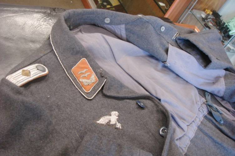 FLIEGERBLUSE (GIACCA DA VOLO) DA UFFICIALE DELLA LUFTWAFFE TEDESCA. SPECIALITA´ TRASMISSIONI (WAFFENFARBE ARANCIO). COMPLETAMENTE MOSTREGGIATA. GRADI DA CAPITANO. AQUILA DA PETTO IN CANOTTIGLIA AGENTO, 1°TIPO. TIMBRI DI ATTAGLIAMENTO E "LBA 41", ALL´INTERNO SULLA FODERA IN SPIGATINO, CONSUNTI MA ANCORA LEGGIBILI. NESSUN BOTTONE MANCANTE. IN OTTIME CONDIZIONI GENERALI, FACENTE PARTE DI UN LOTTO COMPLETO RINVENUTO RECENTEMENTE. (IL PREZZO INDICATO E´ RIFERITO ALLA SOLA GIACCA PRIVA DI BREVETTO PER PERSONALE DI VOLO SPECIALISTA DELLE TRASMISSIONI.