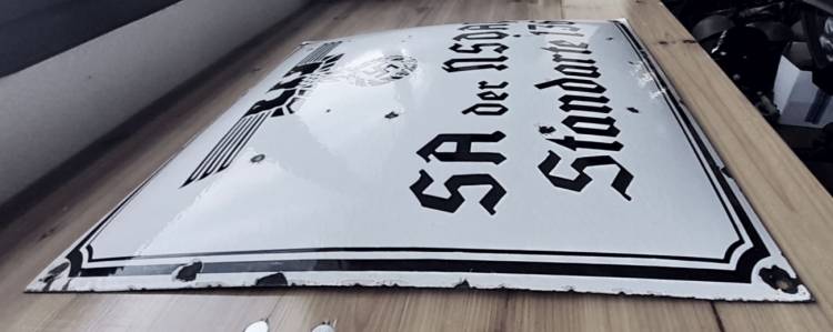 SPLENDIDA TARGA da Edificio in Ferro smaltato bianco a Scritte nere del Comando delle SA di Northeim: ‘SA der NSDAP Standarte 136’. MISURE: cm. 50x50