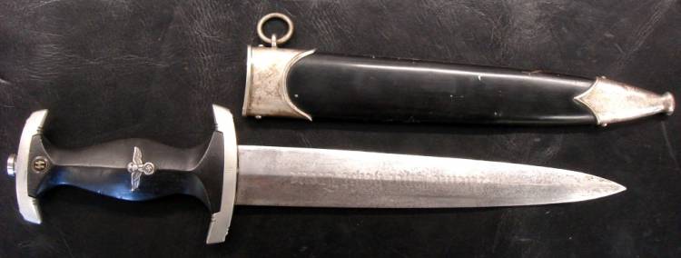 DAGA DA PARATA DELLE SS(Schutzstaffeln)Mod.33. COMPLETA DI FODERO. LAMA INCISA AD ACQUAFORTE CON MOTTO "Meine Ehre heißt Treue"(IL MIO ONORE SI CHIAMA FEDELTA´) DA UN LATO E MARHIO RZM 1053/38 DALL´ALTRO. OTTIME CONDIZIONI.