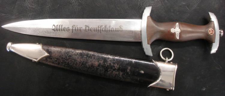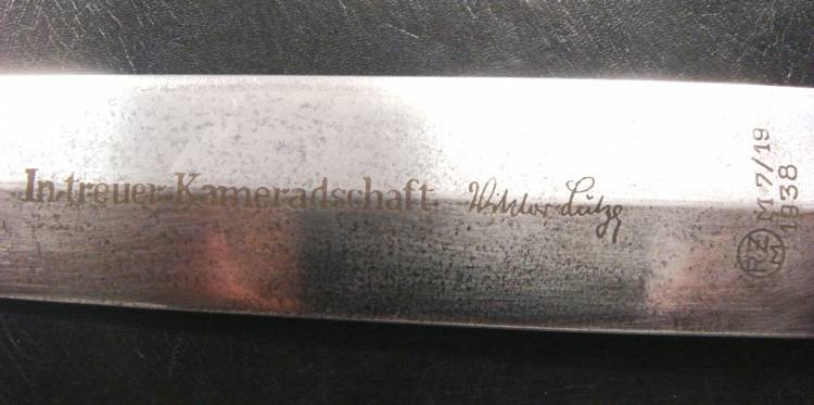 DAGA DA PARATA mod.33 DEL NSKK (Nationalsozialistisches Kraftfahrkorps-Corpo Motorizzato Nazionalsocialista). CON INCISIONE AD ACQUAFORTE DEL MOTTO "ALLES FUR DEUTSCHELAND" DA UN LATO E DEDICA "In Treuer Kameradschaft (firmato)Viktor Lutze", CODICE RZM M7/19 E DATA 1938 DALL´ALTRO. MOLTO RARA. OTTIME CONDIZIONI.