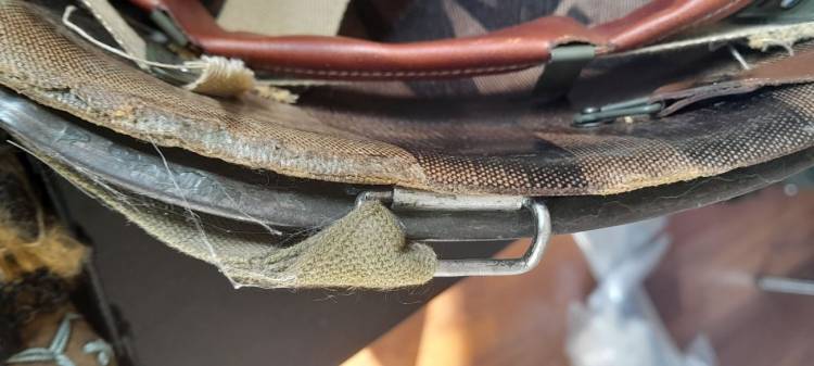 COMPLETO DI LINER, MARCATO. GANCI MOBILI, USATI DAL 1942. TAGLIETTO DELLA BORDATURA SUL DAVANTI.