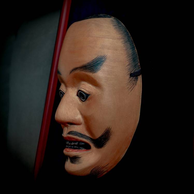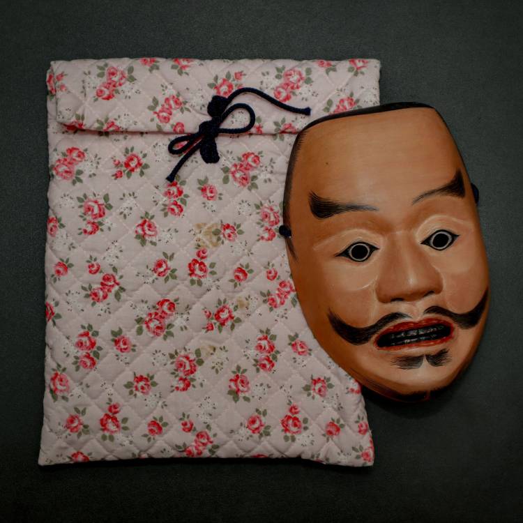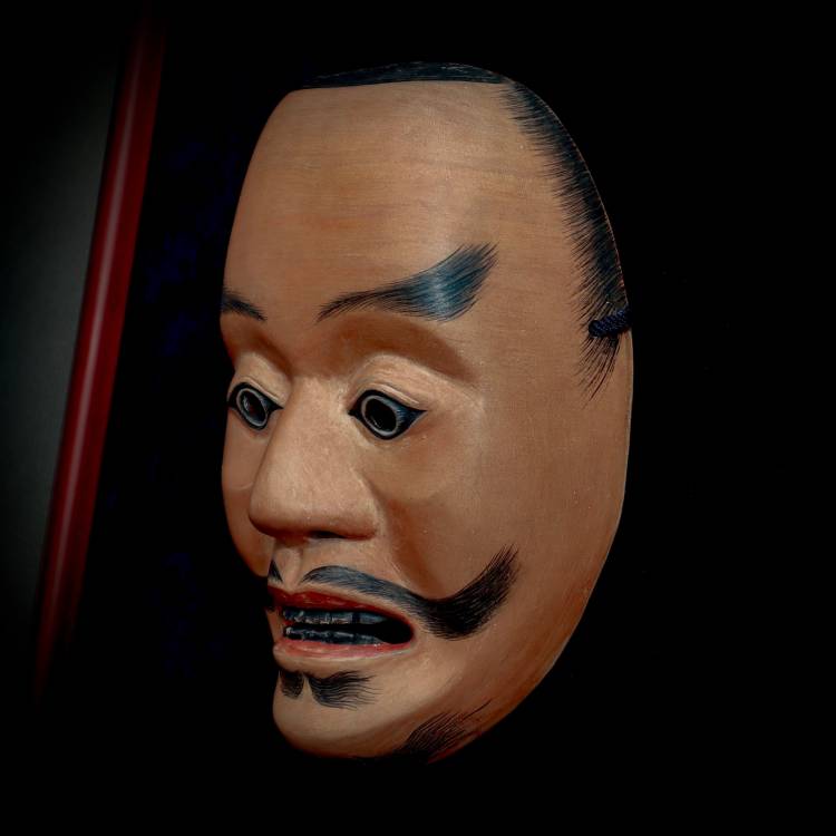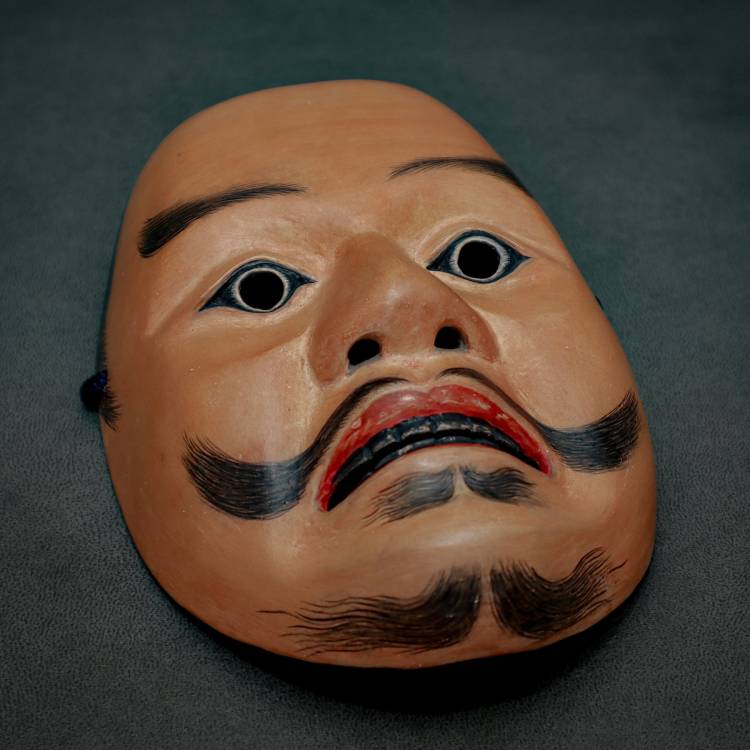 Maschera Noh scolpita in legno di alta qualità usata per i ruoli del guerriero-fantasma Egarano Heita Kanenaga, coraggioso guerriero del periodo Kamakura. Appare nell´opera teatrale Ebira (La faretra). Dimensioni: 21 x 14 x 8 cm.