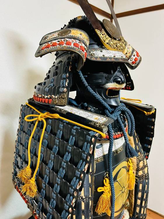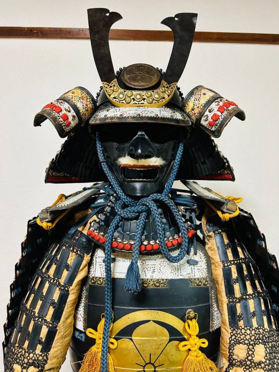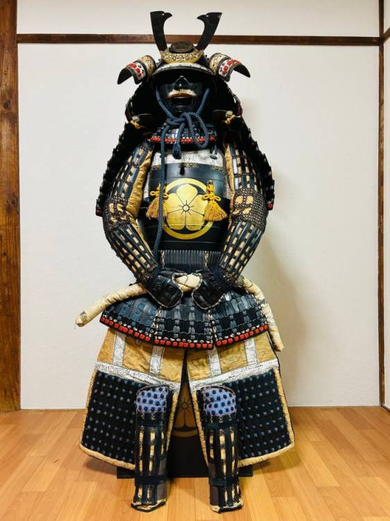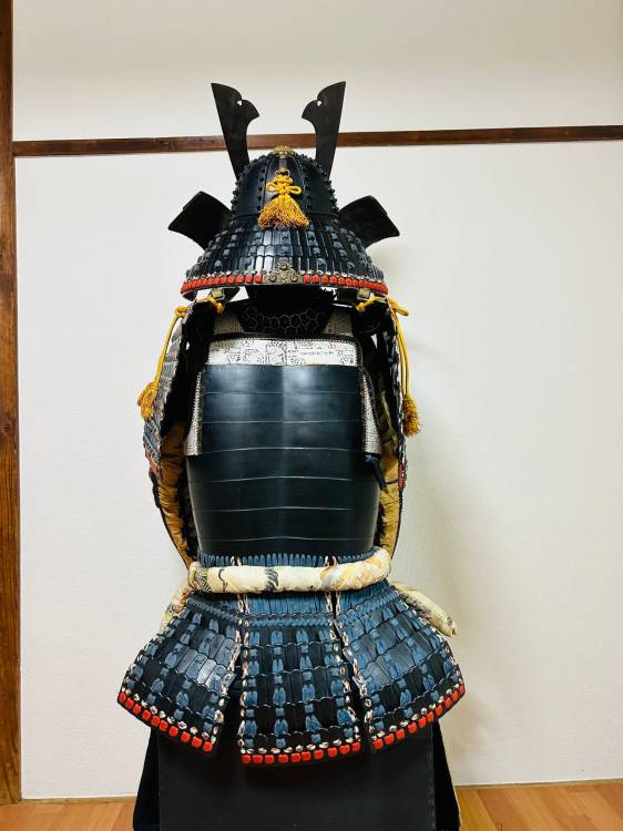 Armatura giapponese laccata nera Yoroi. Corazza a due pezzi (kuro´urushinuri kon´ito hi´suso nimaidô tôsei gusoku) con stemma di famiglia.