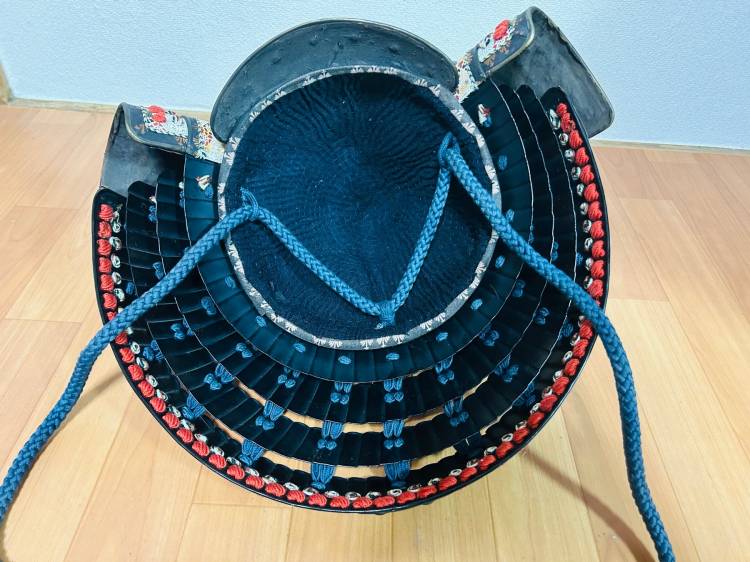 - Suji´bachi Kabuto a 8 piastre in "ferro ruggine" (elmo con creste rialzate) con 12 file di rivetti a cupola. Stemma di famiglia in rame maedate, fiancheggiato da kuwagata a forma di corno.
