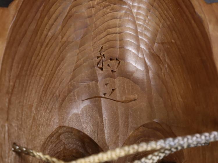 0038-5 Piccola Maschera Noh di Kwan Yin (Guanyin) in legno di Ichii, firmata Kazuyuki.
