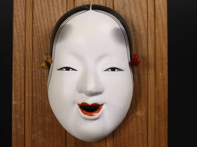 Piccola Maschera Ko-omote in ceramica montata su una targa in legno, firmata e sigillata dall´artista. Dimensioni della targa: H. 22,4 cm La. 11,7 cm Pr. 5,5 cm.