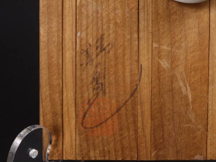 0038-4 Piccola Maschera Ko-omote in ceramica su targa in legno, firmata. Periodo Shōwa.