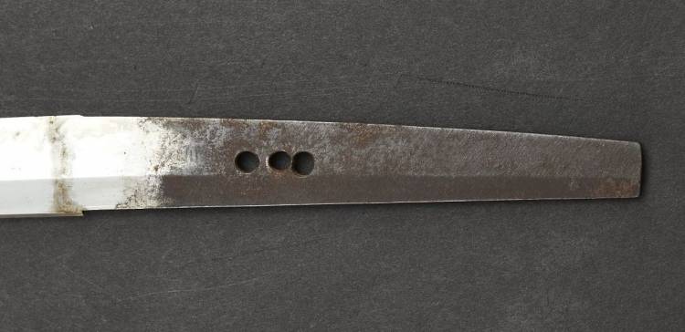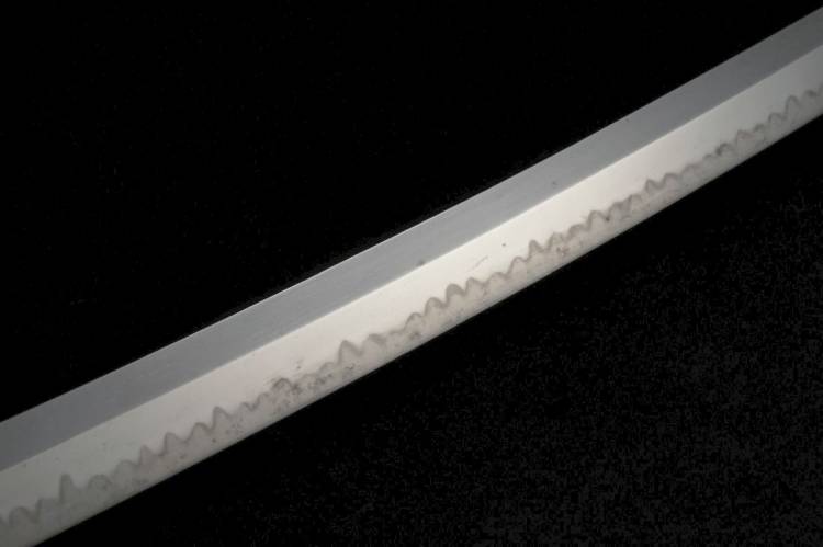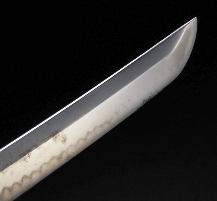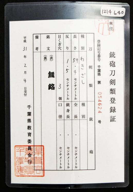dinamicità alla sua fattura. Certificato di registrazione delle armi da fuoco e delle spade (rilasciato dalla Prefettura di Chiba – N. 054624 del 2 Febbraio 2019) in copia, poiché il documento originale deve essere restituito alle autorità. Il certificato elenca la lunghezza della lama (59,4 cm), al limite della misura della Katana, 2 Shaku, la curvatura, Sori, (1,5 cm). Lunghezza totale della lama: 75 cm. Lunghezza totale: 93 cm.