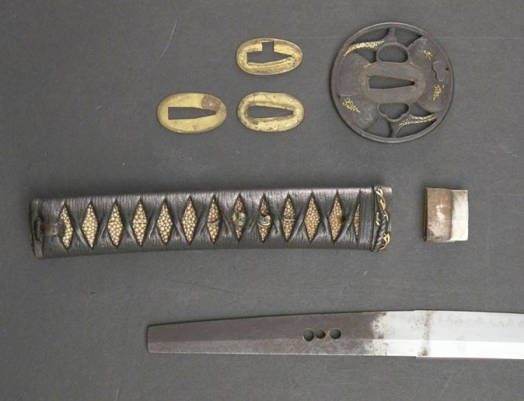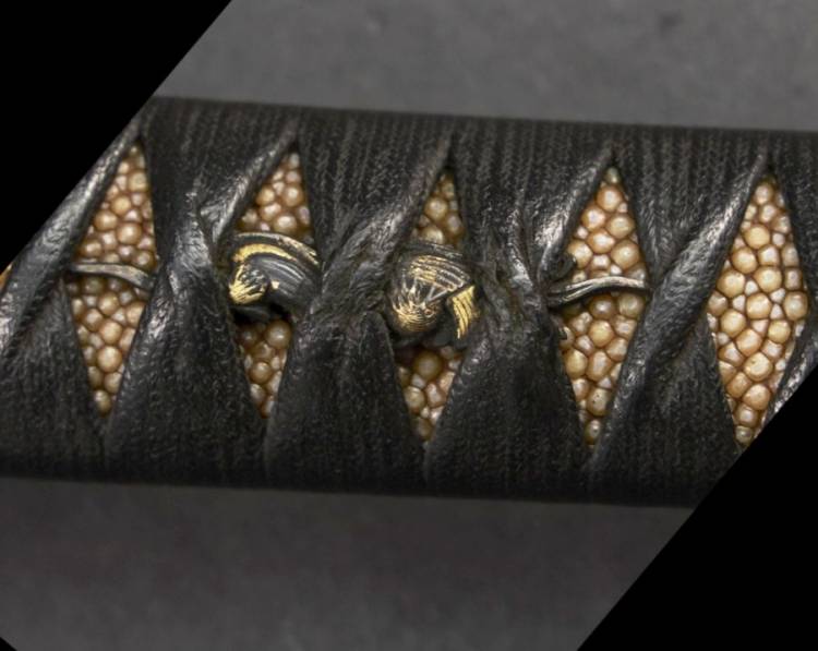 Il Kashira presenta un design in ottone intarsiato con foglie e un´aragosta spinosa, un motivo associato alla longevità e alla resistenza. I Menuki sono una coppia di anatre mandarine intarsiate in ottone, che rappresentano amore, fedeltà e armonia, poiché sono spesso raffigurate come coppie inseparabili. La lama ha uno straordinario Hamon (linea di tempra) che aggiunge