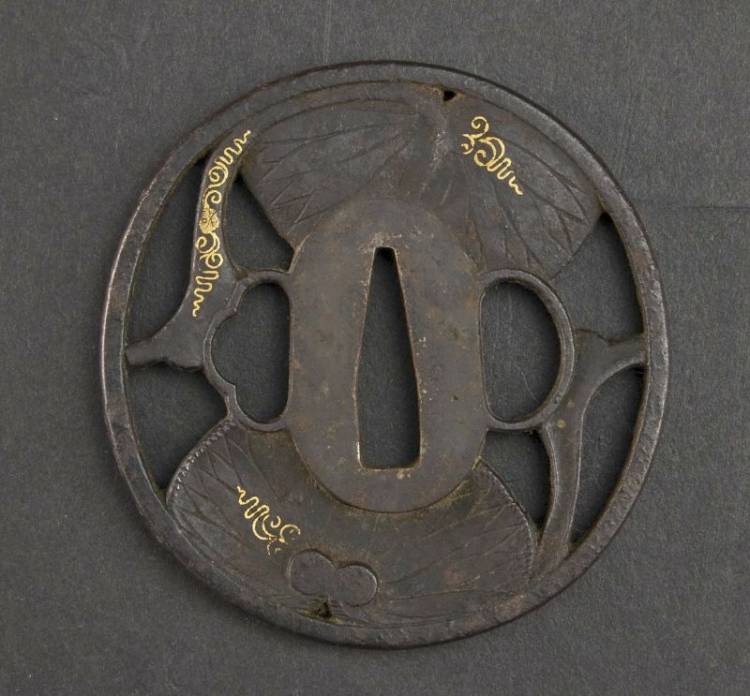 La Sukashi Tsuba è realizzata in ferro, con un intricato disegno dello stemma Aoi traforato con intarsi in ottone. La tsuba è firmata Echizen Jū Kinai, rinomati artigiani Kinai del periodo Edo. La stirpe Kinai è una delle più celebri scuole di artigiani di tsuba, originaria del tardo periodo Muromachi e continuata per sette generazioni sotto la famiglia Takahashi fino all´era Meiji. Vasta documentazione sulle tsuba Echizen Kinai nell’opera "Echizen Kinai Tsuba" di Nobuo e Nobuei Tsuruoka. Il Fuchi è decorato con un intarsio in ottone di corde shimenawa in altorilievo, che simboleggiano la purificazione e la protezione nella tradizione giapponese.