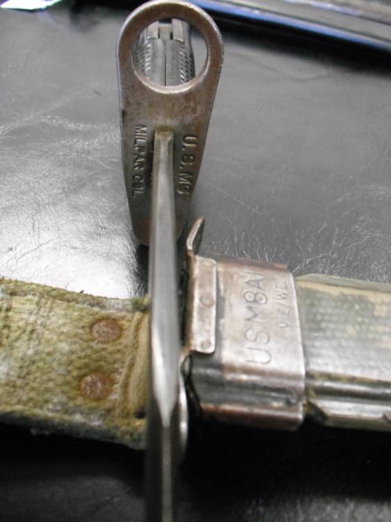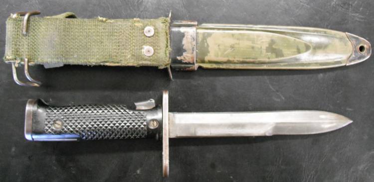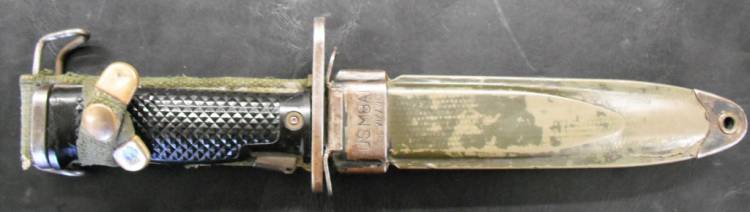 BAIONETTA M6 PER M.14. MARCATA SUL GUARDIA-MANO "U.S. M6 MILPAR COL". COMPLETA DI FODERO M8. CONDIZIONI BUONE. FODERO PORTATO CON VERNICE CONSUMATA IN PIU´ PUNTI.