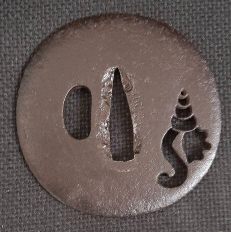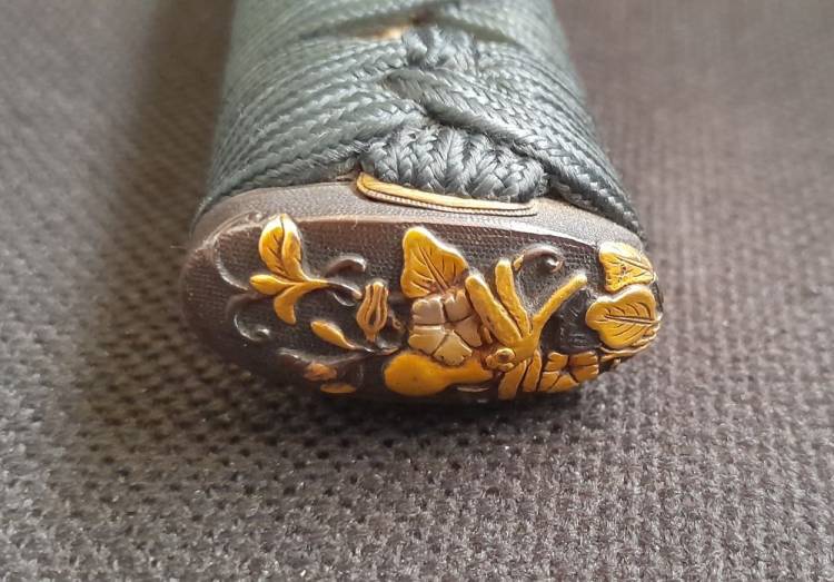 Sukashi Tsuba firmata. Fuchi, Kashira e Menuki sono decorati con intarsi in ottone/oro floreali e zoomorfi.