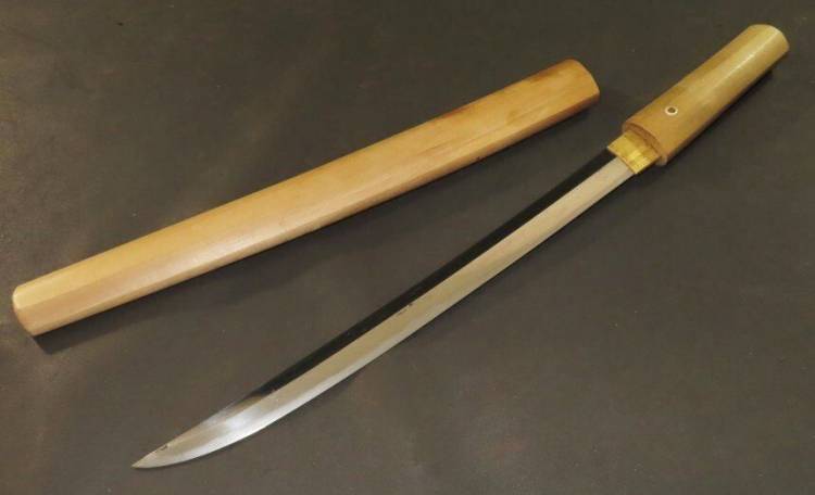 Wakizashi in shirasaya (fodero in legno). Lunghezza Totale 58 cm., Nagasa 38.5 cm., Sori (curvatura) 0,7 cm., 2 mekugi-ana.