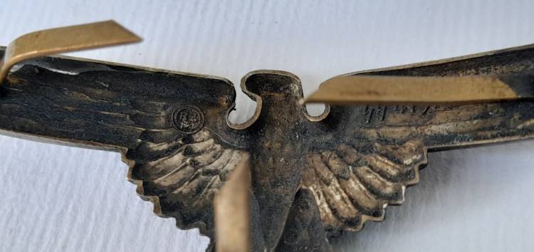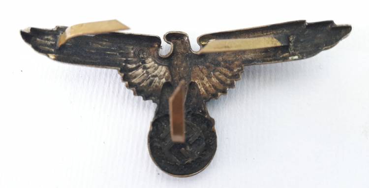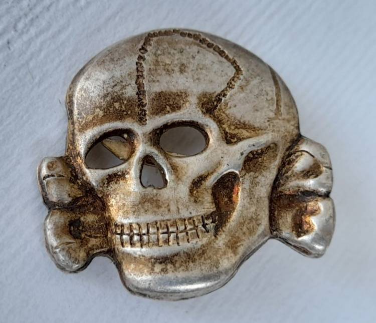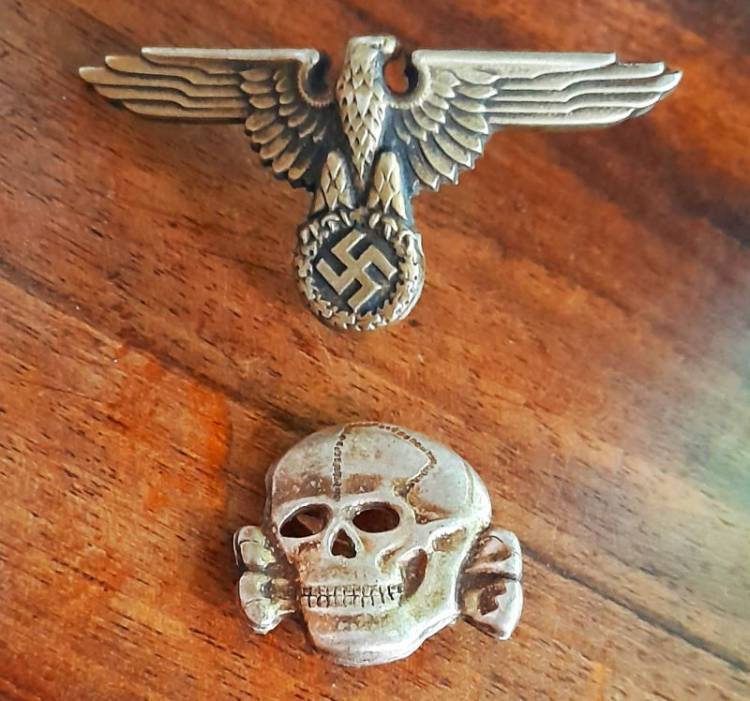 UN BUON ABBINAMENTO PER COMPLETARE UNO SCHIRMUTZE SS UFF. O TRUPPA. AQUILA A 3 GANCETTI IN OTTONE MARCATA ´RZM SS 475-42´ E TESCHIO A 2 GANCETTI MARCATO ´RZM 1/122´. CONDIZIONI ECCELLENTI.