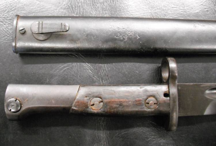 BAIONETTA PER FUCILE MAUSER YUGOSLAVO. MODELLO LUNGO. GUANCETTE IN LEGNO. COMPLETA DI FODERO IN METALLO.