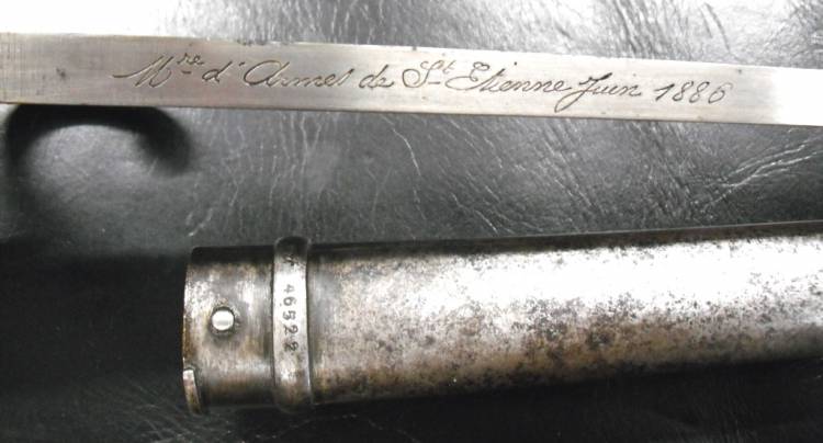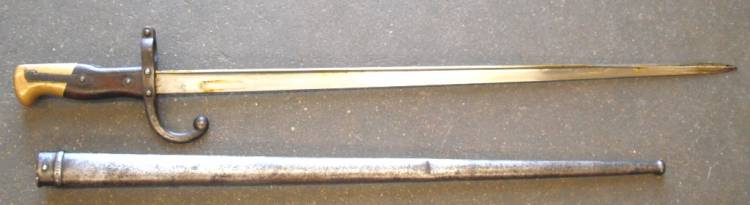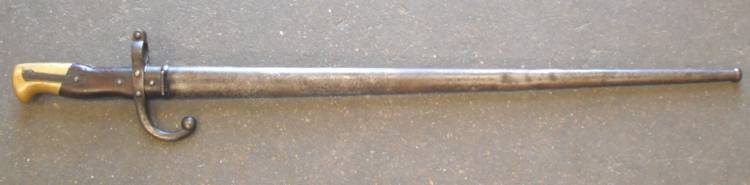 BAIONETTA PER FUCILE GRASS. GUANCETTE I LEGNO E ATTACCO IN OTTONE. LAMA MARCATA CON INCISIONE A MANO, SUL DORSO, "M.re ARMES de St.ETIENNE JUIN 1886". COMLETA DI FODERO IN METALLO. BUONE CONDIZIONI.