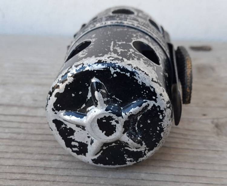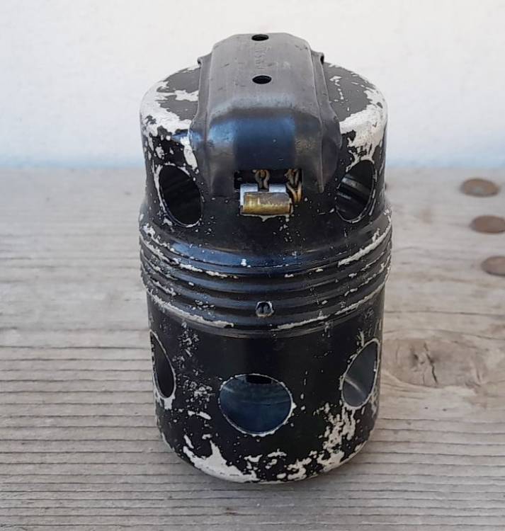 ESTREMAMENTE RARA. BOMBA A MANO ´Po.55´ A TEMPO. BREVETTO DEL 1952 PROGETTATA DA ETTORE MANZOLINI. NE FU COSTRUITO UN UNICO LOTTO DALLA ´C.M.S.A.´ (Costruzioni Meccaniche Aeronautiche Società Anonima) DI MARINA DI PISA, DISTRIBUITO ALLA SOLA AVIAZIONE.