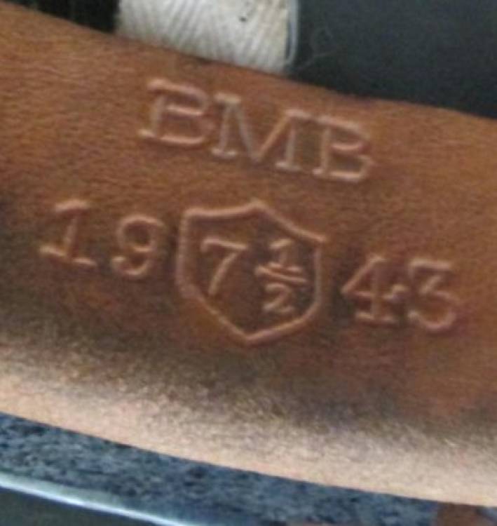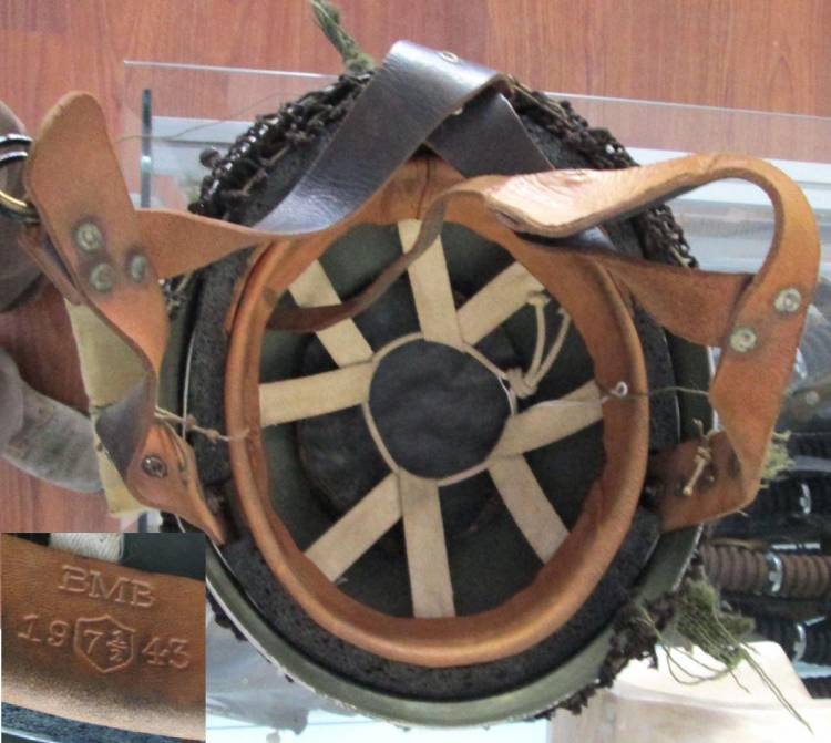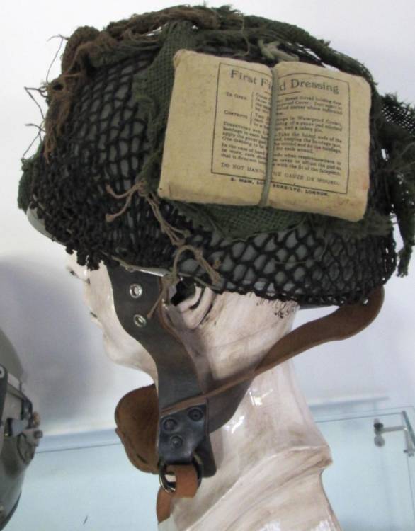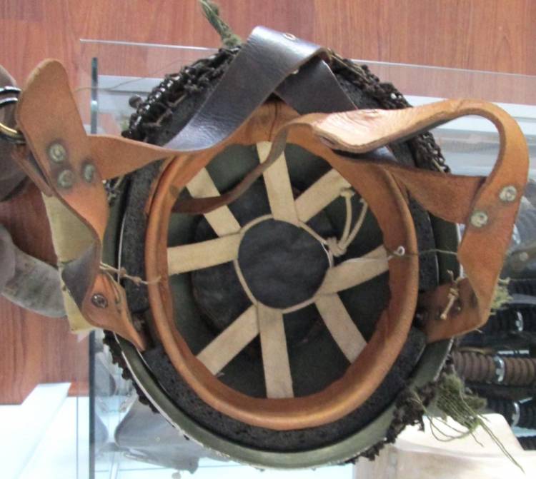 ELMO INGLESE PARA´ Mod. MKI (2° Mod.). HA IL SOGGOLO ANCORA IN CUOIO, MA IL BORDO IN FIBRA E´ SOSTITUITO DA UNA PIATTINA DI METALLO.