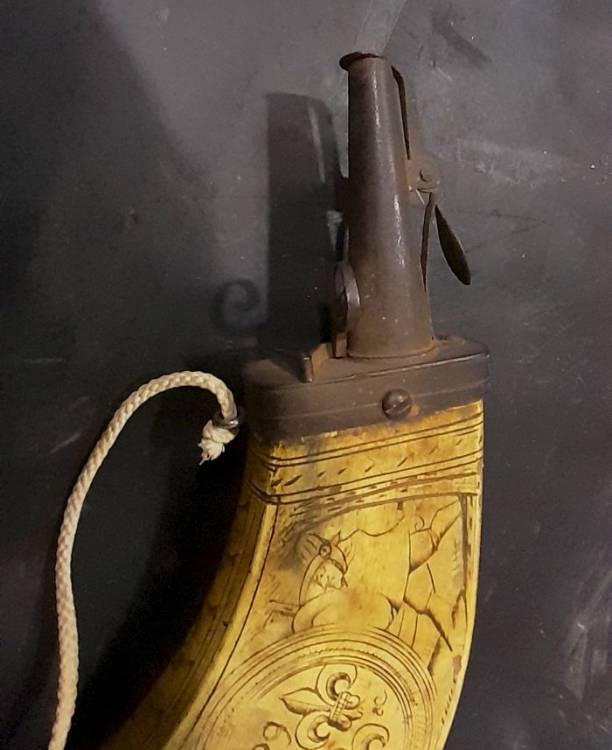 BELLA FIASCA PER POLVERE FRANCESE DEI PRIMI ANNI DEL ´600. COSTRUITA IN CORNO E FERRO, è COMPLETAMENTE GRAFFITA CON MOTIVI ANTROPOMORFI E I TRE GIGLI DI FRANCIA. CONDIZIONI MOLTO BUONE.