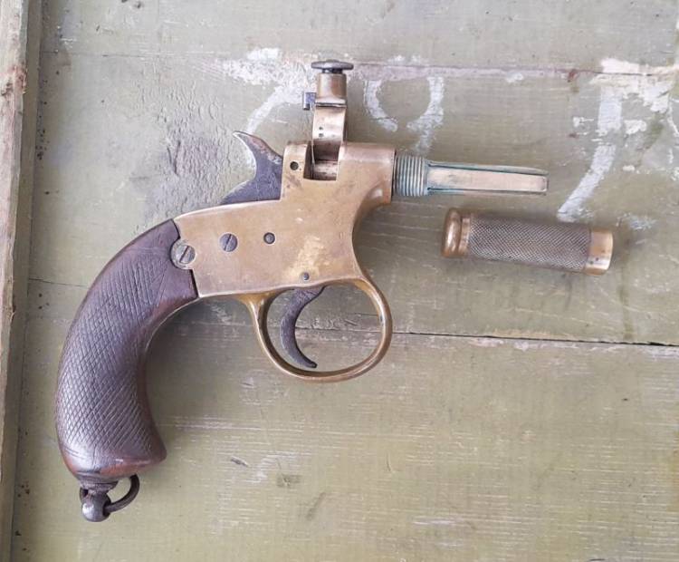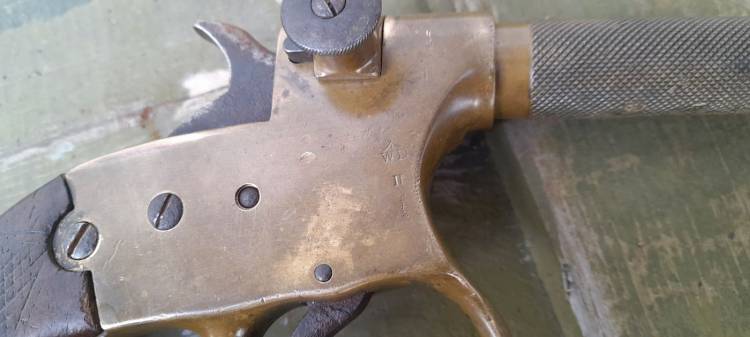 Rarissima pistola accenditore britannica ´Igniter´. Veniva fornita ai Royal Engineers e alla Royal Navy per accendere la miccia nei lavori di brillamento e demolizione. Fu prodotta dal 1880 al 1915 circa. La parte esterna della canna veniva svitata e la miccia veniva fatta passare attraverso di essa, per poi essere riavvitata.