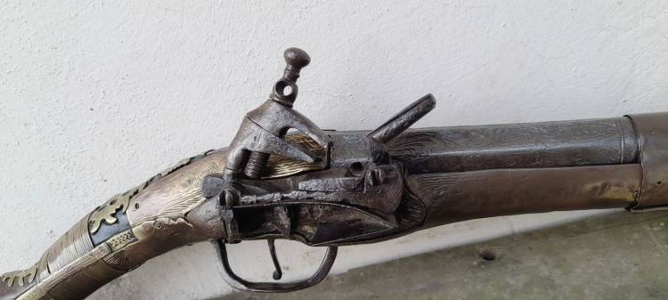 IMPORTANTE PISTOLA A PIETRA BALCANICA CON FORNIMENTI IN OTTONE, BRONZO E ACCIAIO.