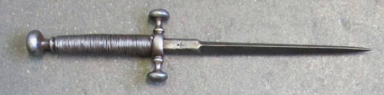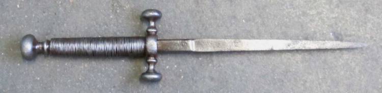 STILETTO DI AREA GERMANICA CON LAMA A SEZIONE TRIANGOLARE. BELLA MARCA A FORMA DI CROCE PATENTE. PARTICOLARE L´IMPUGNATURA, A FASCIATURA FILIFORME. CONDIZIONI MOLTO BUONE.