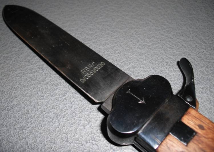 COLTELLO IN DOTAZIONE ALLE TRUPPE PARACADUTISTE. II° TIPO (BRUNITO). MONOMATRICOLA. MARCATO SULLA LAMA CON IL CODICE RBNr. 0/0561/0020.